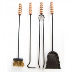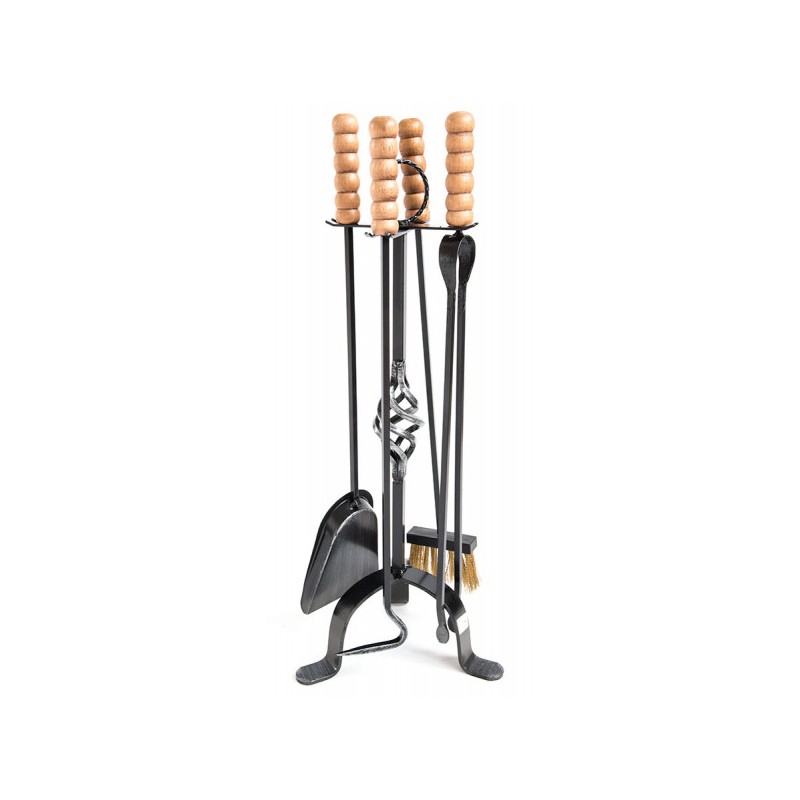 Il kit comprende il supporto e quattro utensili di ottima qualità con impugnature antiscottatura in legno: paletta, scopetta in setole d'ottone, attizzatoio e pinze.