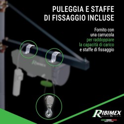 Fornito con carrucola per raddoppiare il carico e staffe di