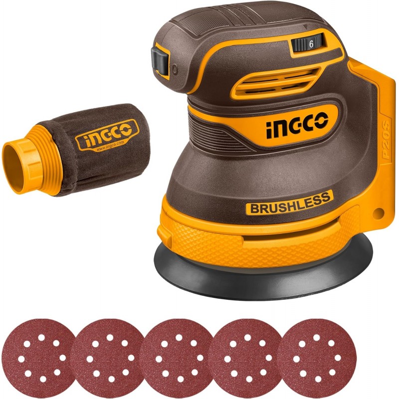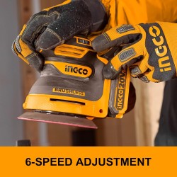 INGCO Levigatrice orbitale casuale senza fili da 20 V, 125 mm (solo corpo), motore senza spazzole, 6 velocità variabili, 5 carte vetrate, levigatrice elettrica ideale per levigare, lucidare il legno