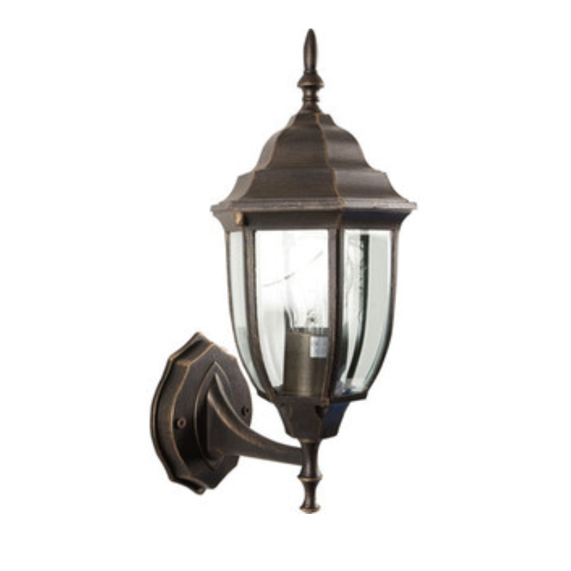 Corpo in alluminio pressofuso verniciatocon polveri epossidiche.Finitura bronzo anticato.Schermo di protezione in vetro.Per lampade da 60 WDimensioni 16x19xh38 cm