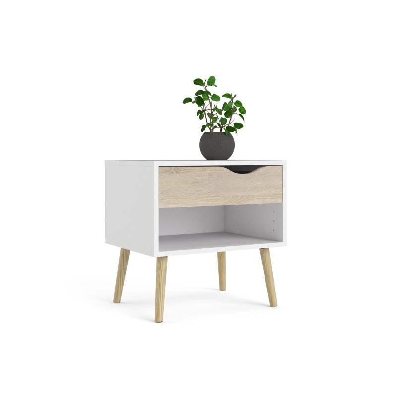 ha un cassetto con guide metalliche, con frontale colore rovere e maniglia ritagliata. Pratico vano contenitore nella parte inferiore. Eleganti gambe svasate in legno, e struttura di colore bianco Facile da montare e da pulire. Dimensioni 50,2 x 39,1 x h 49,7 cm.