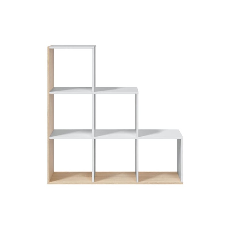 decorativa a forma di scaletta con 6 cubi 34 x 34 cm. Pannello truciolare melaminico spessore 15 mm. Bordi PVC spessore 0,6 mm . Tacchetti ABS antirumore e antigraffio per la parte inferiore del mobile. Dimensioni 108 x 28 x h 111 cm. Colore bianco artik e rovere canadian. Peso imballo 20 kg.
