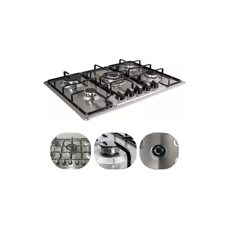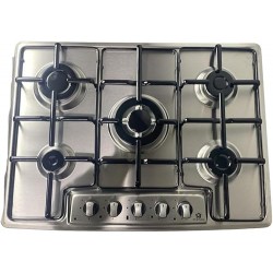 da incasso a 5 fuochi gas di cui 1 Wok. Griglia e coperchi bruciatori in ghisa pesante. Accensione automatica mediante pulsante. Sistema di sicurezza di spegnimento del gas (Safety Gas Control). Adatto per la conversione a GPL. Tensione/Alimentazione 220-240 V. Larghezza 685 mm. Lunghezza 510 mm. Spessore 85,7 mm.